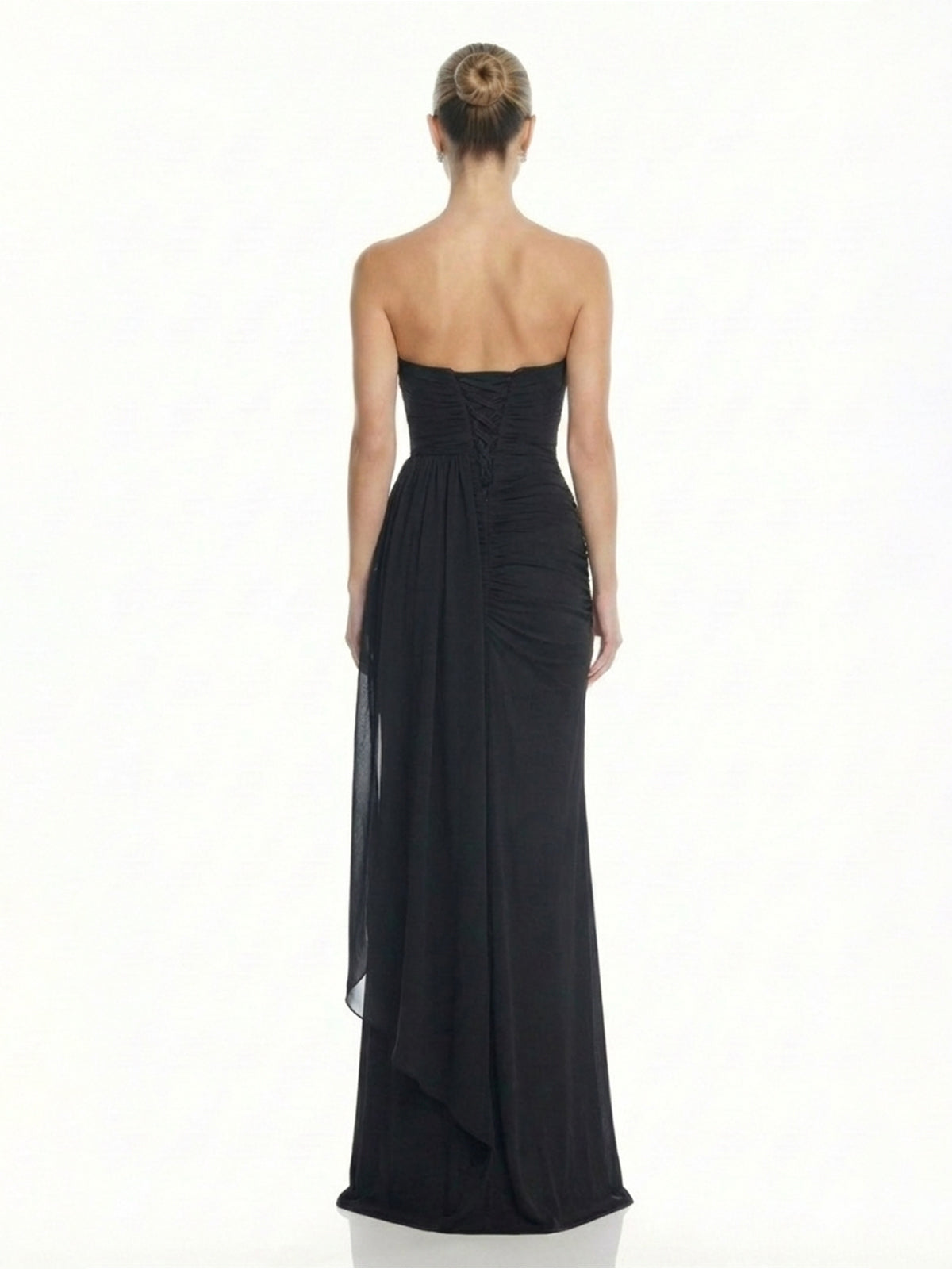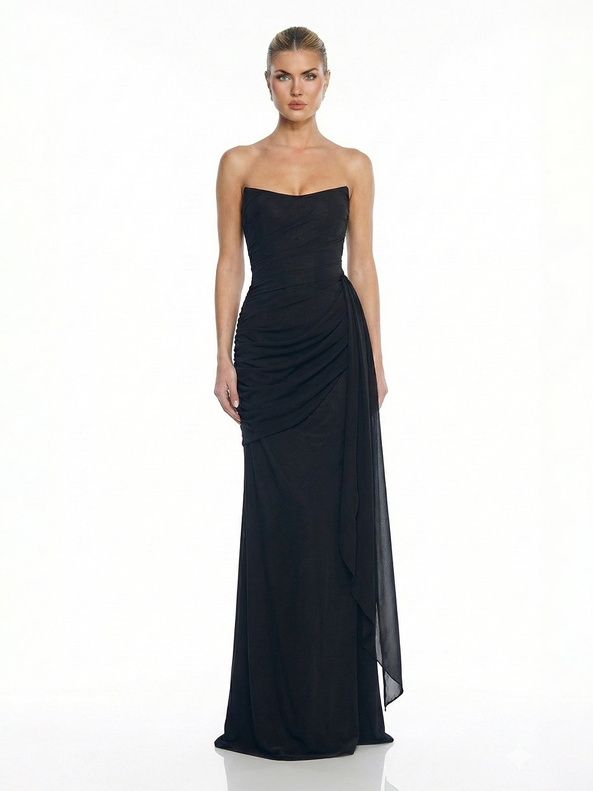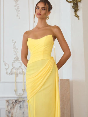 Effortless elegance is the vibe. This dreamy gown features a soft, matte finish that drapes beautifully against the body. The strapless bodice is artfully ruched to hug your curves, while the cascading side sash adds a touch of Greek goddess glamour. Finished with a subtle thigh-high slit for ease of movement, it’s the perfect choice for twirling on the dance floor at a wedding or prom.