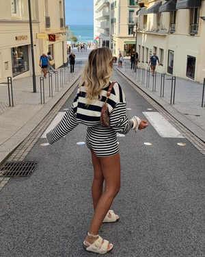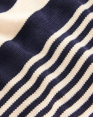 • Design Elements: Horizontal navy stripes, shoulder button detail, ribbed cuffs