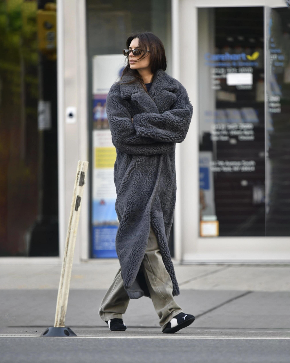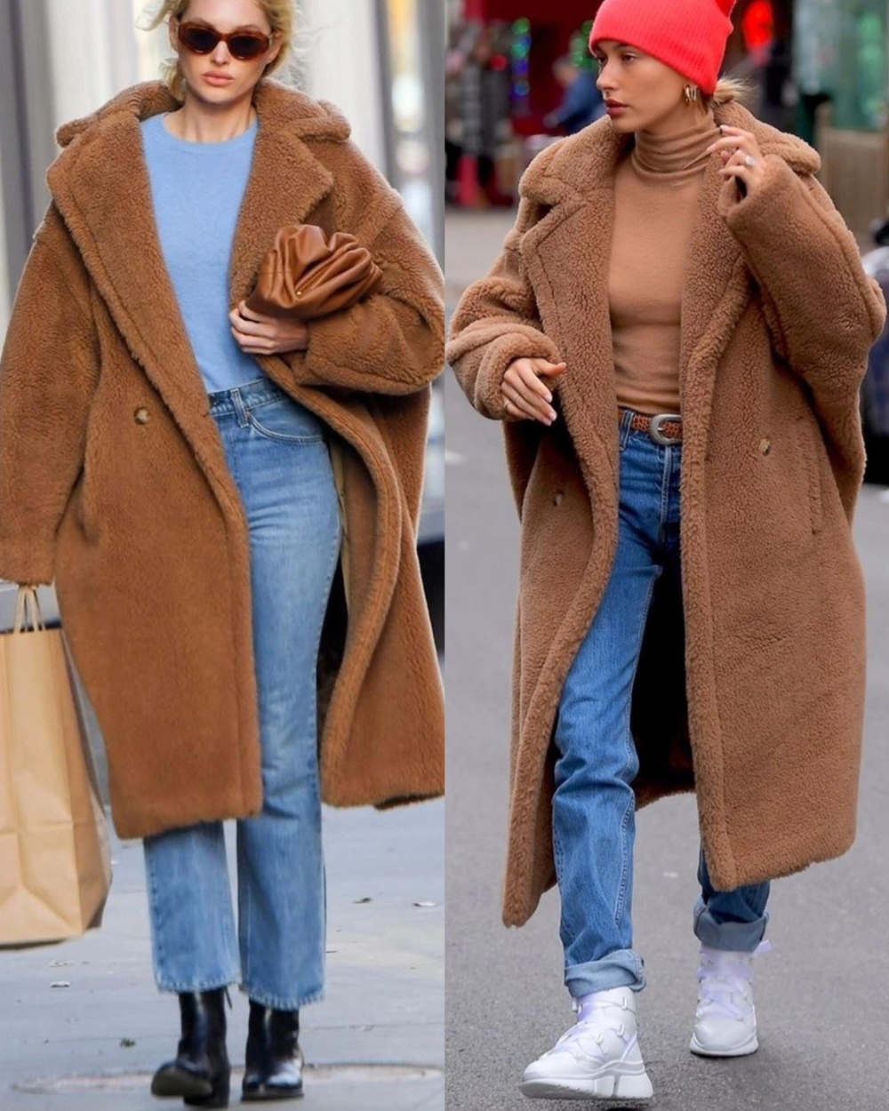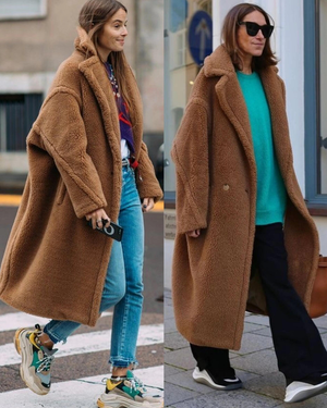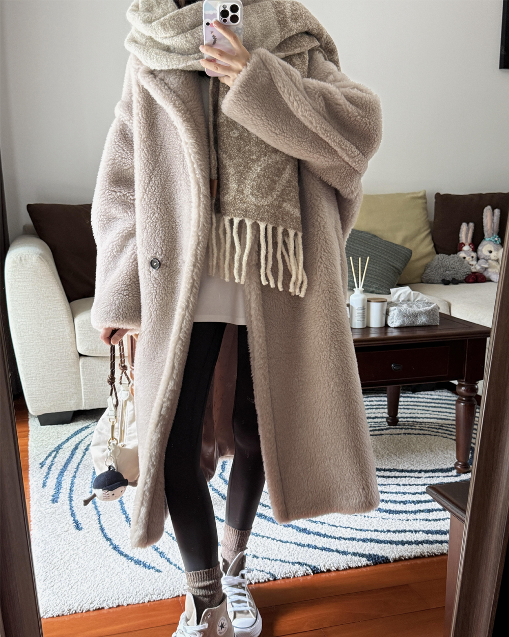 - Design Elements: Oversized cocoon silhouette, wide lapel collar, drop shoulders, and knee-length warmth