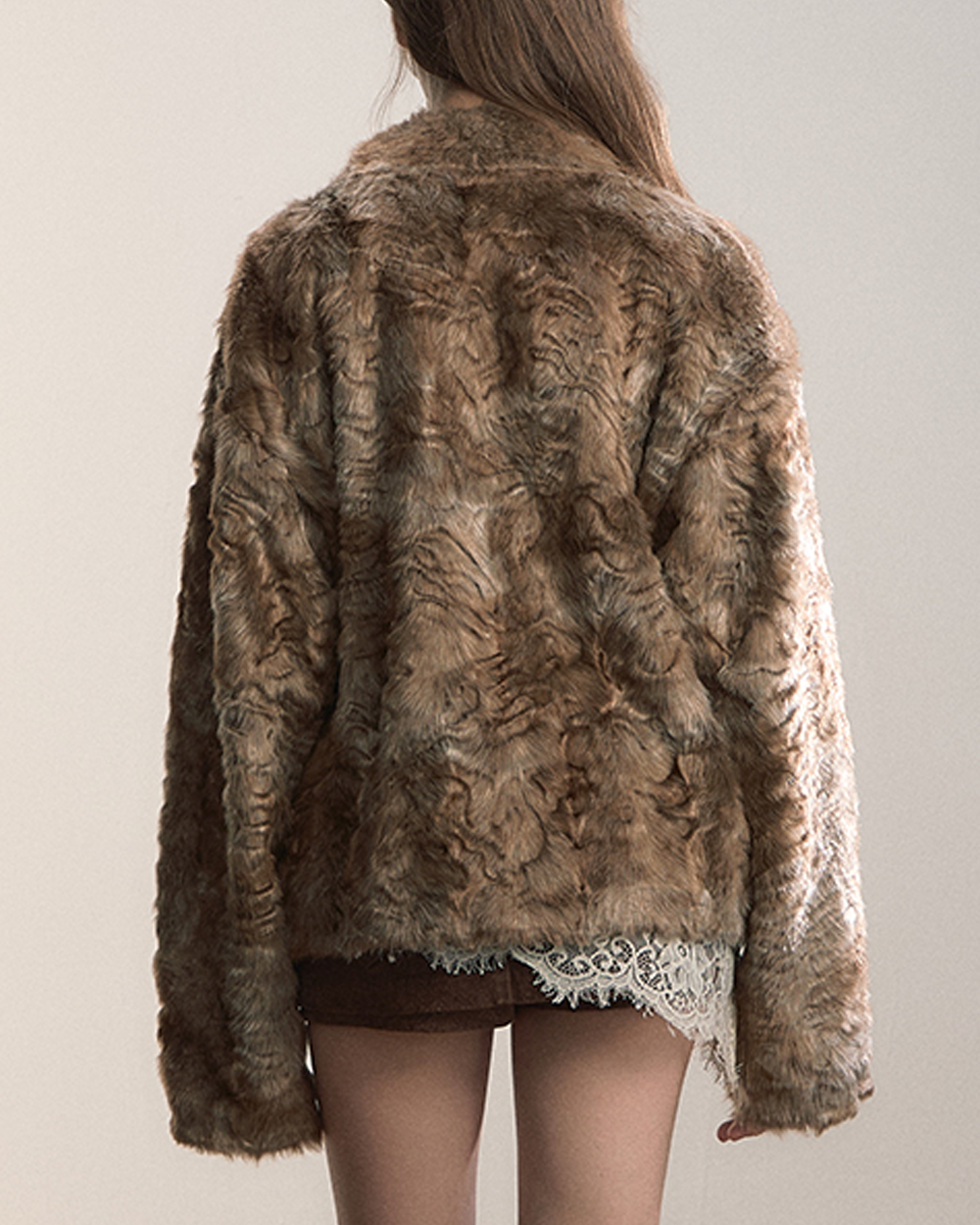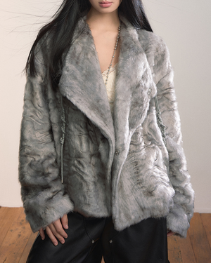 • Design: Oversized lapel, embossed faux-fur texture, asymmetrical zipper closure