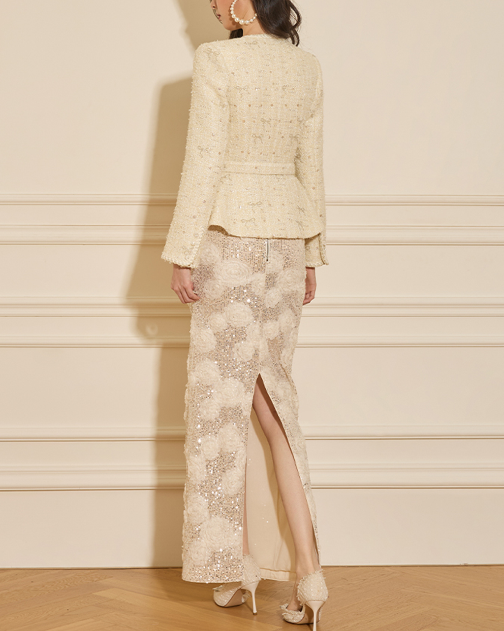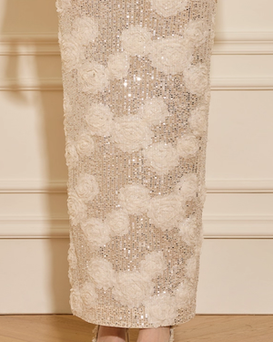 • Design Elements: Full sequin floral pattern, straight pencil silhouette, elegant mid-high waist